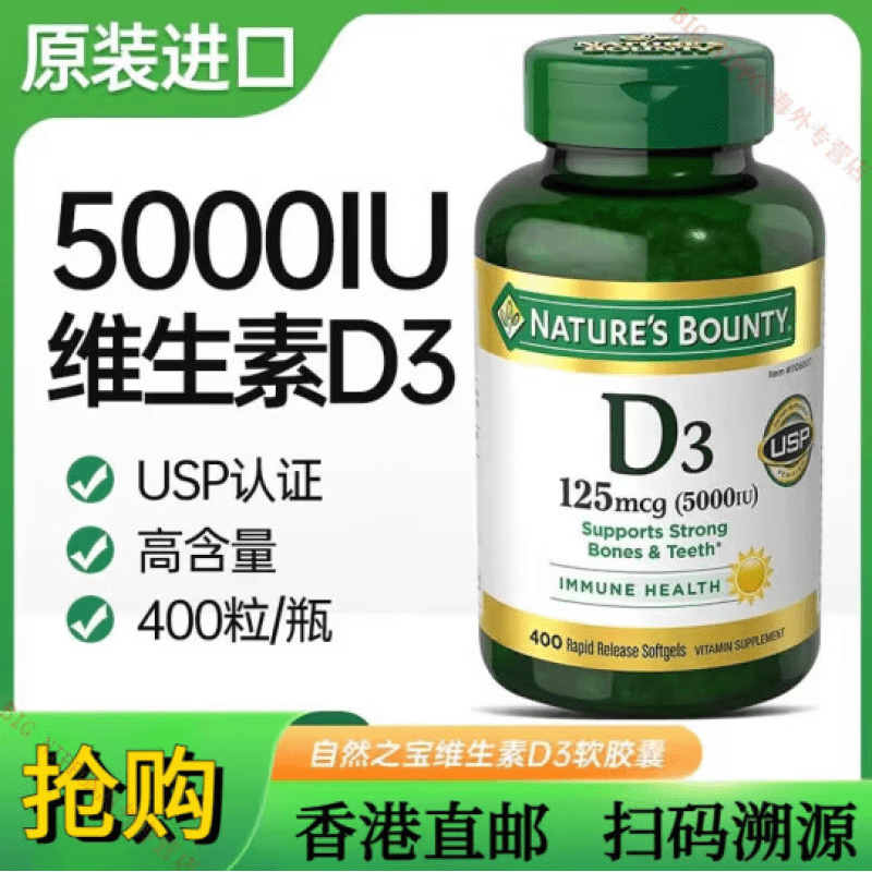 维生素D3软胶囊400粒5000IU高效补钙青少年孕妇易吸收 效期27年1月香港免税邮2瓶