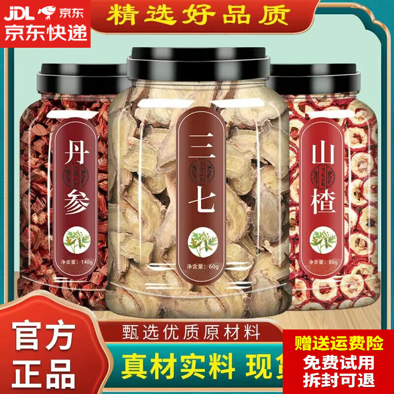 同仁堂(TRT)原料三七丹参山楂三合一片泡茶三七云南文山粉山楂茶材滋补养生 三七片+丹参+山楂 250g*3罐