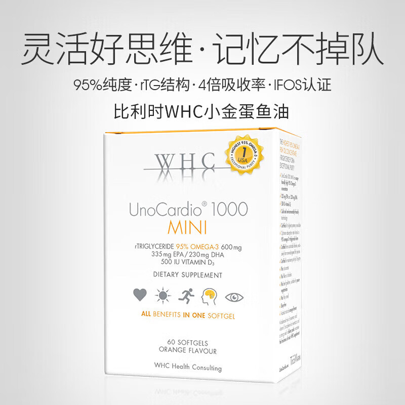 WHC小金蛋鱼油95%高纯度 rTG结构Omega3 维生素D 60粒