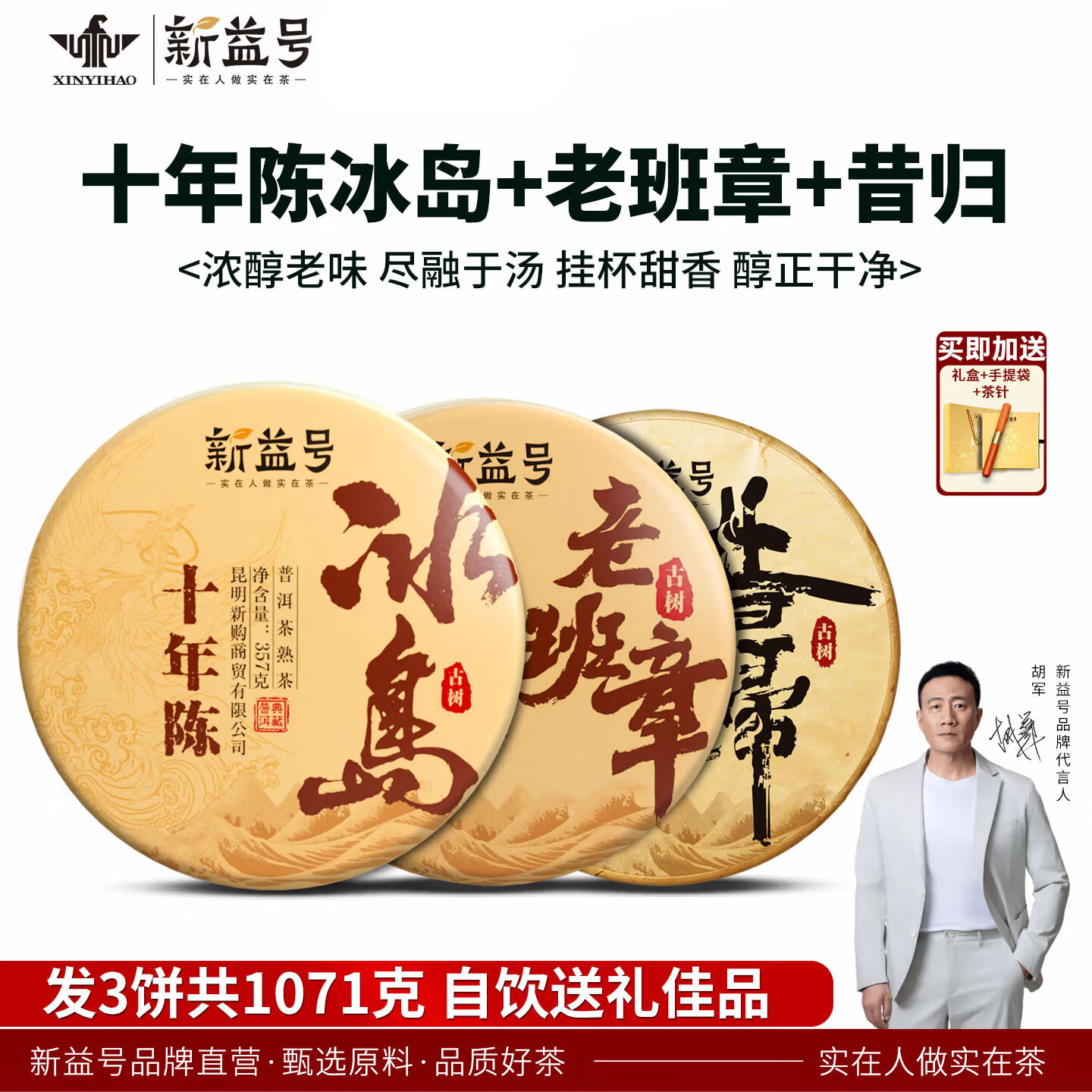 新益号冰岛普洱茶熟茶十年以上古树茶老茶云南七子饼熟茶叶礼盒送礼长辈 1071g【十年陈冰岛+老班章+昔归】共发3饼