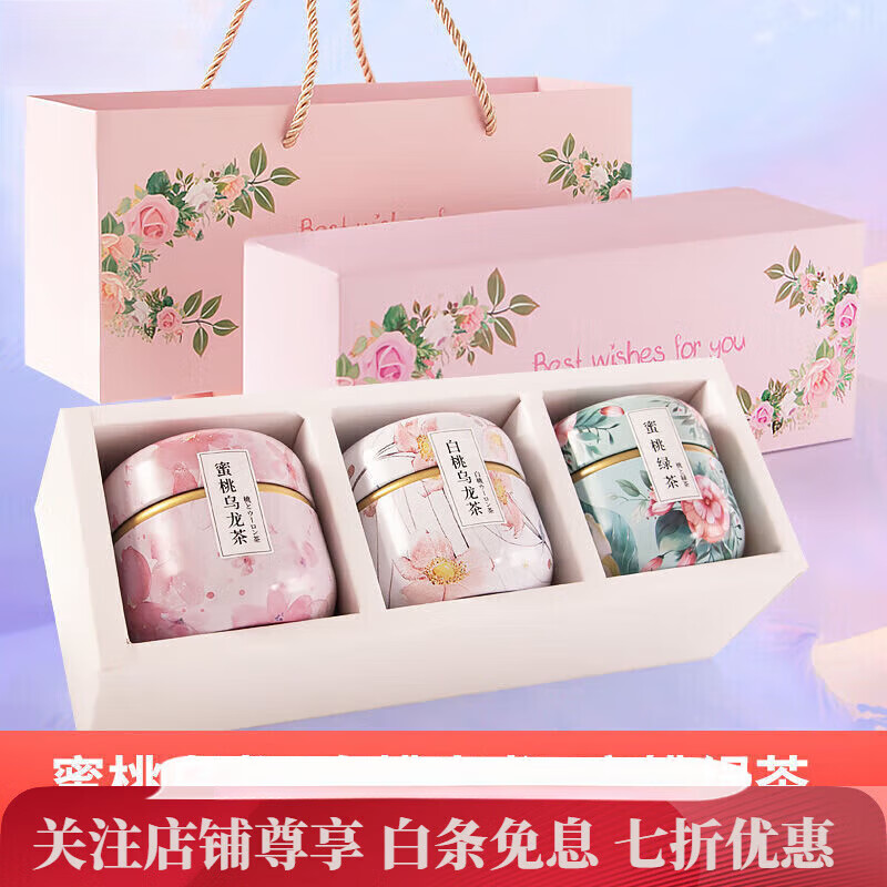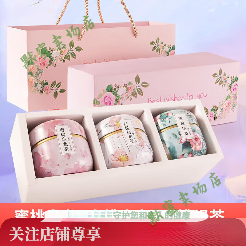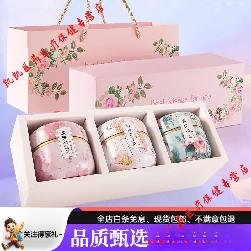 通用花果茶礼盒茶叶礼盒装送礼伴手礼物蜜桃乌龙茶+白桃乌龙+蜜桃绿茶 礼盒装+手提袋+3罐蜜桃乌龙茶组合