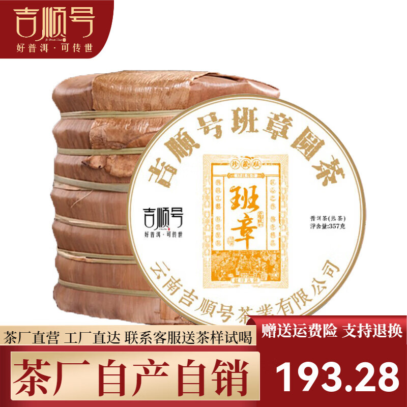 吉顺号云南普洱茶熟茶饼印级易武班章冰岛357克*3片套餐普洱熟茶饼 黄印班章7片【1提】 357克/片