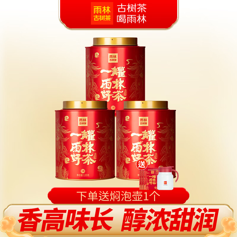 雨林古树茶茶叶云南古树红茶一芽一叶滇红茶 一罐雨林好茶 龙珠沱茶自饮送礼 3罐装360g+焖泡壶