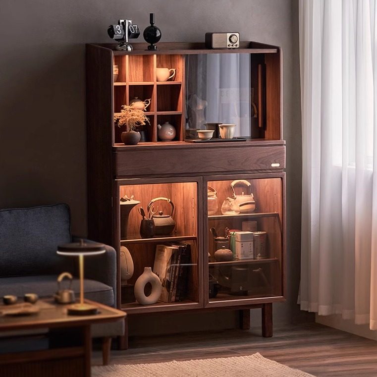 茶具示柜沙发边柜黑胡桃木茶叶收纳柜茶室储物柜书柜博古架