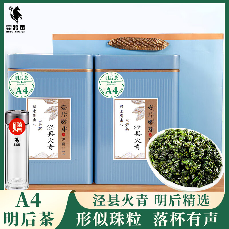 霍将军泾县火青A3A4罐装正宗2026安徽泾县涌溪绿茶火青绿茶叶自己喝500g A4明后茶500克罐【赠双层杯】