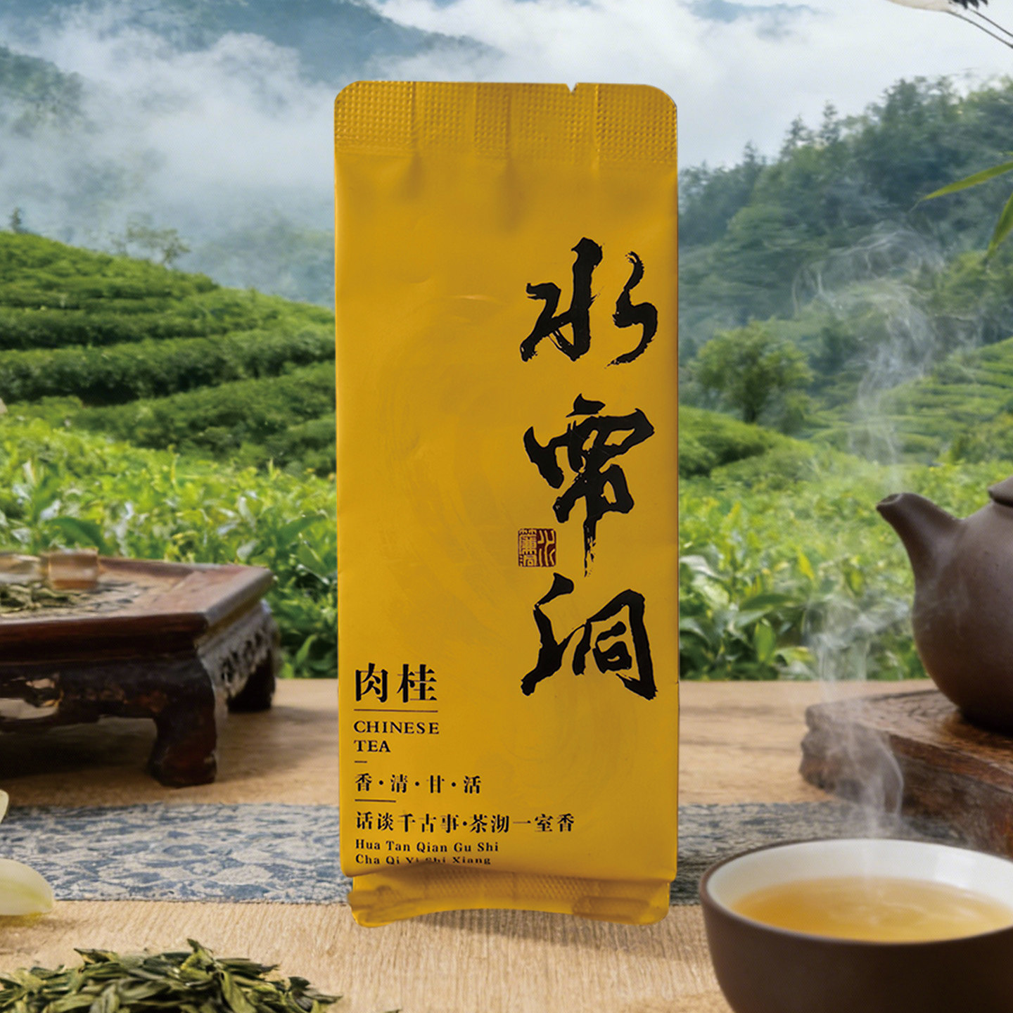 高档茶叶独立包装袋黄色复古长款水帘洞肉桂三仰峰茶袋铝箔袋分装