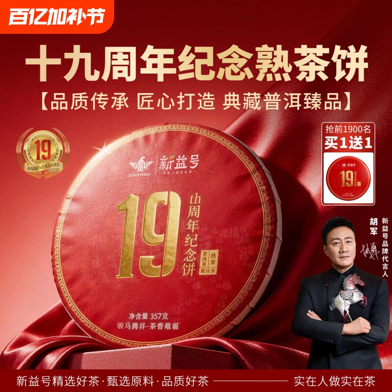 买1送1新益号19周年纪念饼熟茶云南七子饼茶叶古树普洱茶熟茶饼