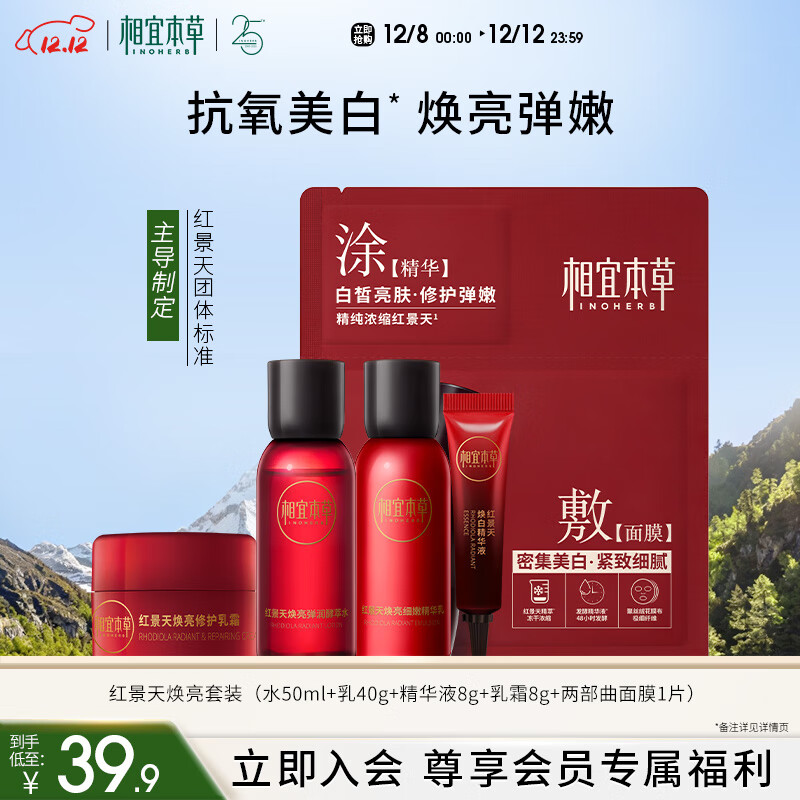 相宜本草红景天焕亮焕白精致礼包(水乳精华液修护乳霜面膜)试用护肤品