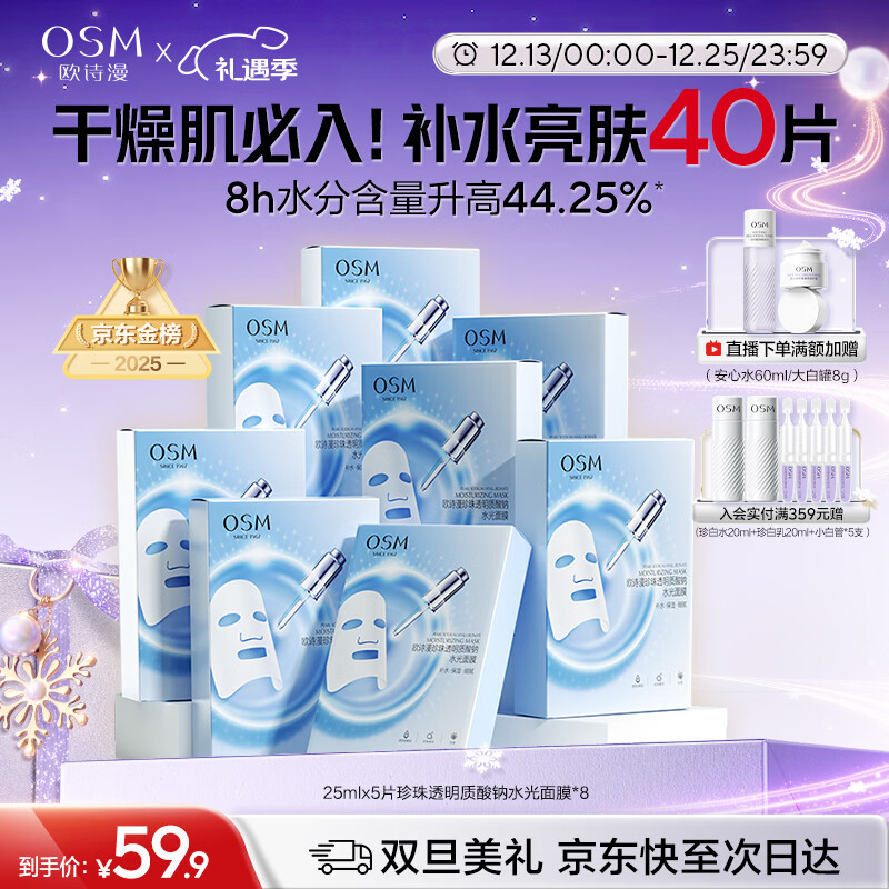 欧诗漫(OSM)透明质酸钠水光补水面膜 圣诞礼物送女友 5片*8盒40片