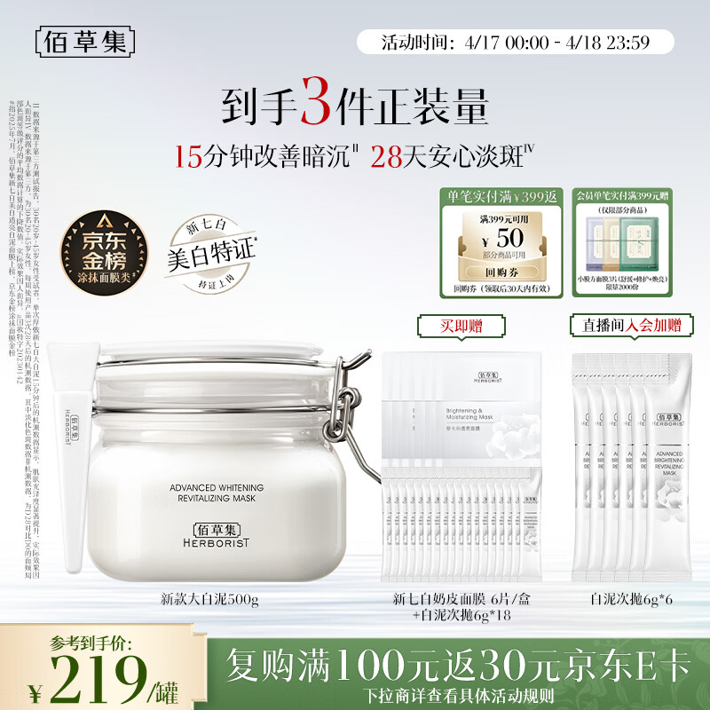 佰草集大白泥面膜500g美白清洁泥膜补水淡斑新七白涂抹面膜提亮生日礼物