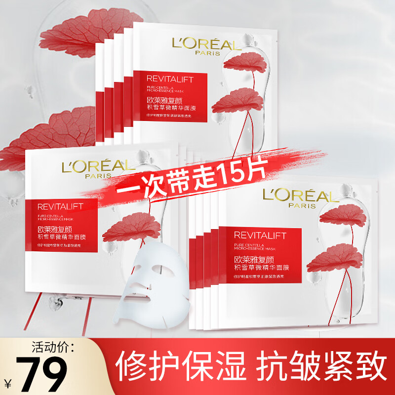 欧莱雅(LOREAL)面膜女补水积雪草精华面膜保湿淡纹修护抗皱紧致提亮肤色护肤品 积雪草修护面膜*15片