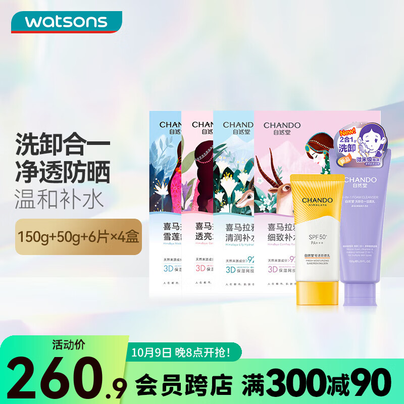 自然堂屈臣氏洁面防晒面膜礼盒 洁面乳150克+防晒乳50克+面膜4款