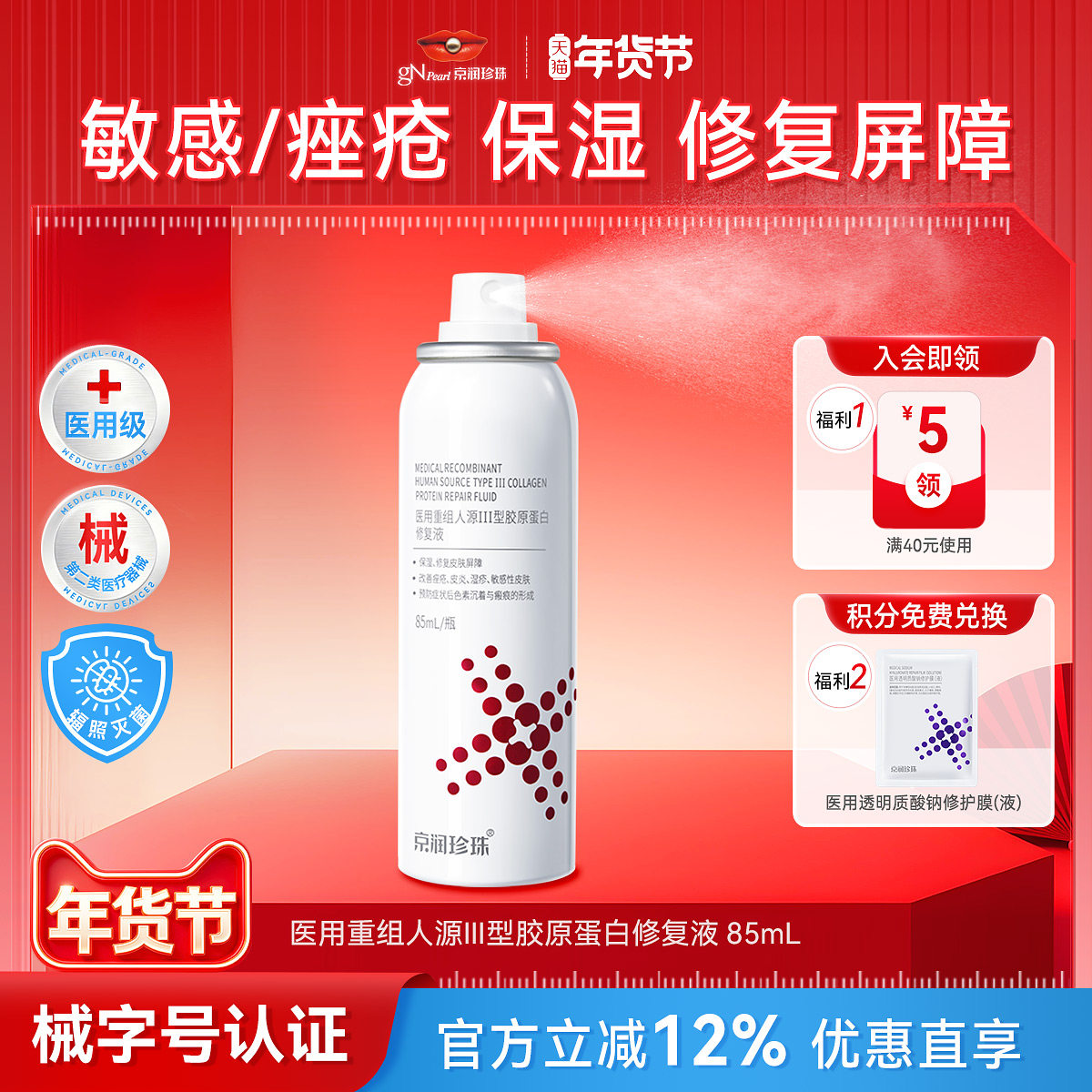 京润珍珠医用胶原蛋白修护液械字号敷料非面膜术后修护喷雾正品