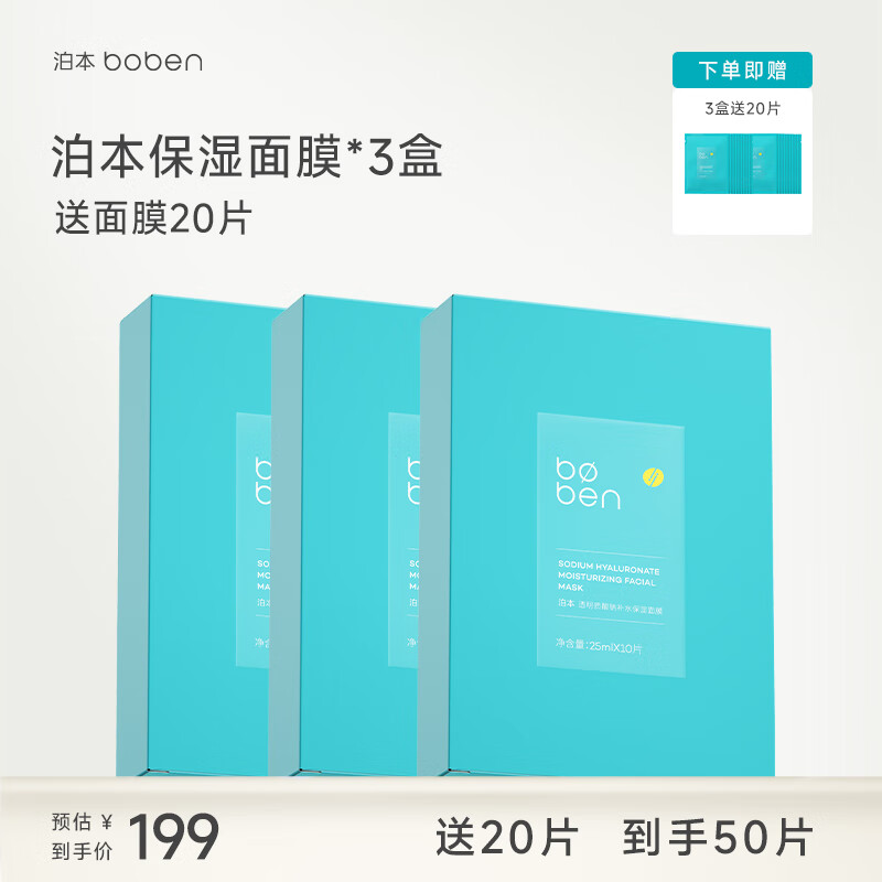 泊本 6D玻尿酸透明质酸钠补水保湿面膜 温和修护敏感肌 3盒(送20片,到手50片)