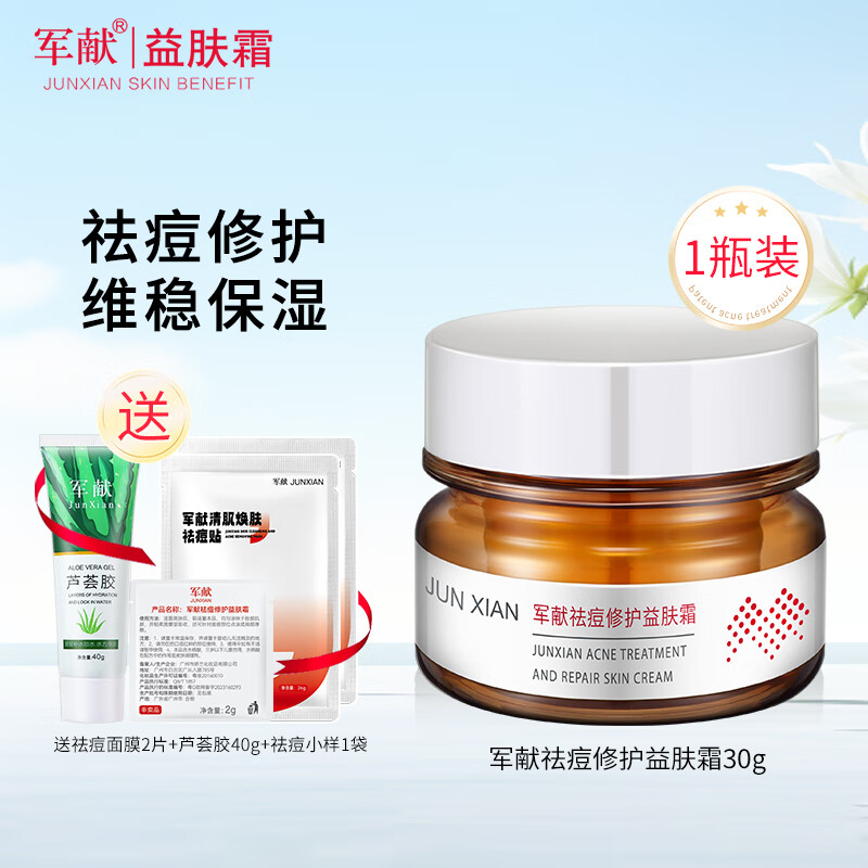 军献祛痘修护益肤霜30g祛痘修护痘坑护肤品面霜祛粉刺去青春痘痘男女 祛痘益肤霜( 1瓶装 )+面膜芦荟胶