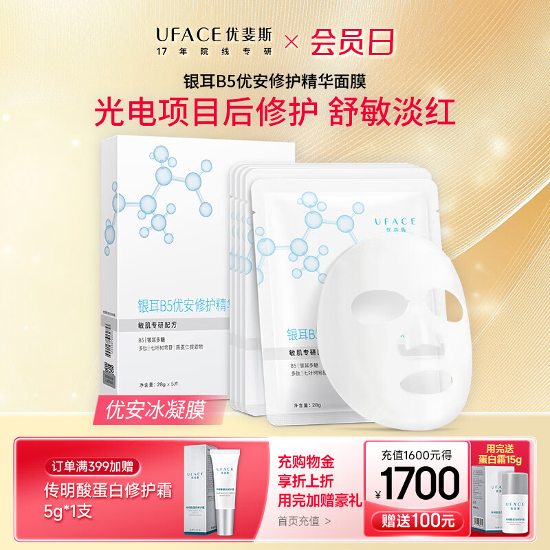 优斐斯银耳B5优安修护精华面膜 舒缓修护补水保湿敏肌专研 28g*5片/盒