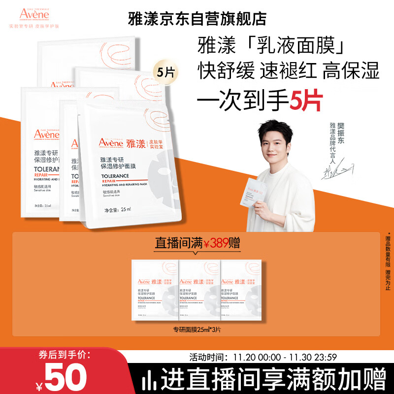 雅漾(Avene)【樊振东同款】专研保湿修护面膜5片 舒缓泛红补水敏感肌贴片面膜