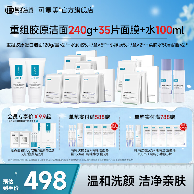 可复美氨基酸洁面套装透明质酸钠盈润精华面膜保湿水 胶原洁面+水润贴+控油净痘面膜+柔肤水
