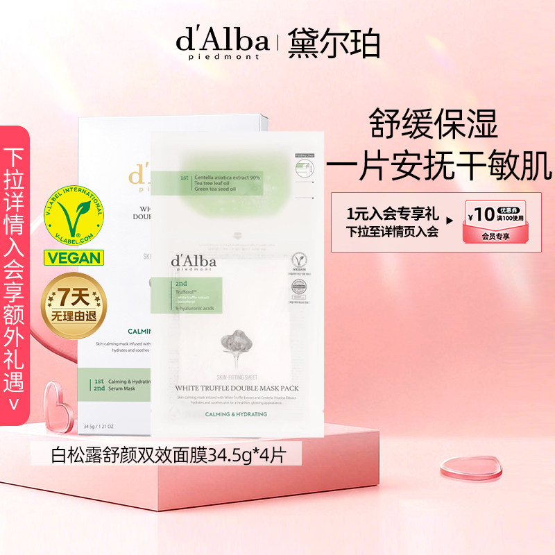 【特价】dalba黛尔珀白松露双效纯素面膜舒缓补水34.5g*4【临期】
