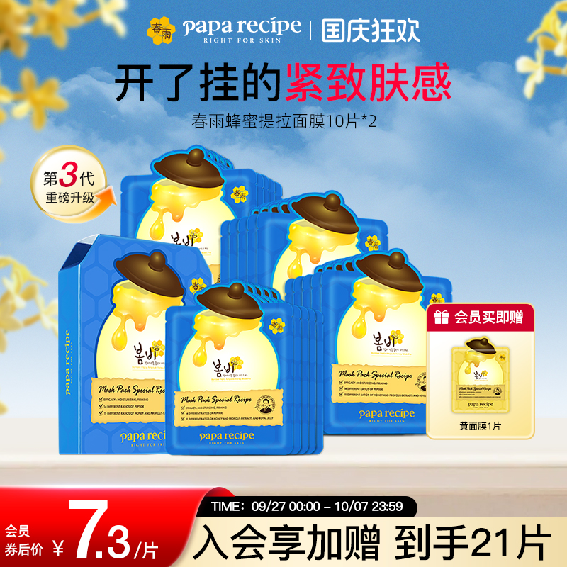 韩国进口paparecipe蓝春雨蜂蜜提拉面膜3.0紧致补水保湿20片正品