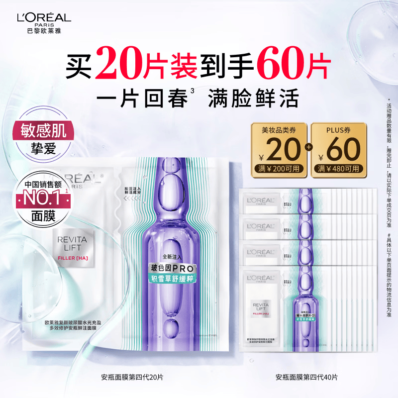 欧莱雅安瓶面膜4.0含赠到手60片补水保湿修护舒缓护肤品生日礼物送女友