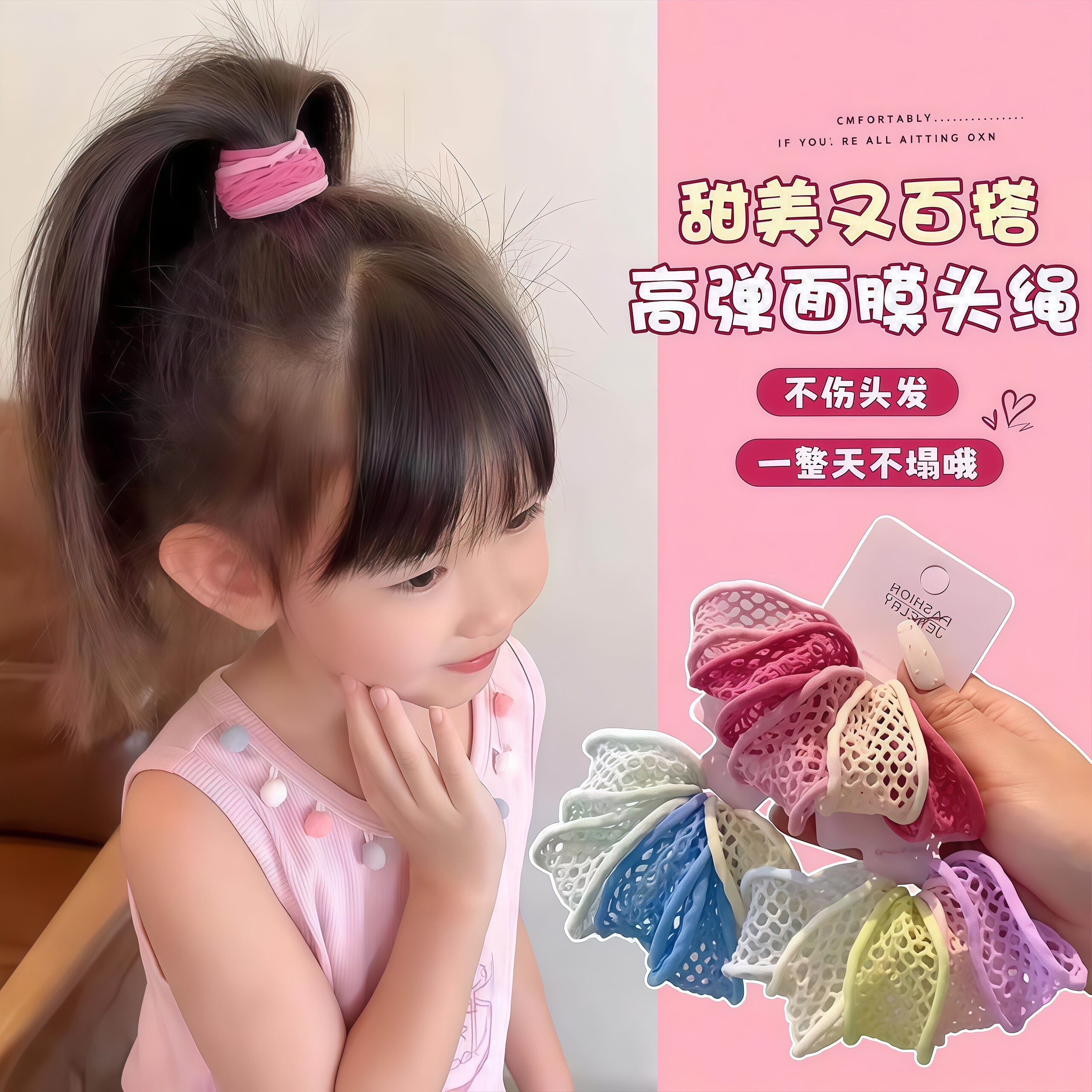 儿童彩色加宽镂空面膜发圈女童上学扎发高马尾发绳高弹力皮筋头饰