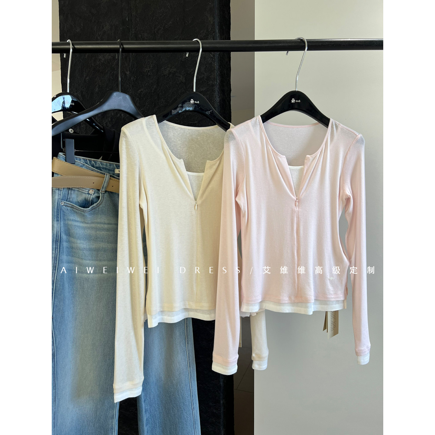 特价!早春小众设计师款】亲肤面膜T恤 拉链V领撞色休闲长袖上衣