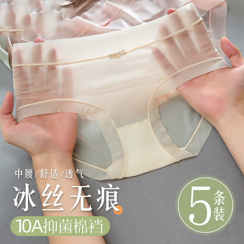 5条装 冰丝无痕冰机面膜内裤女纯棉裆中腰少女包臀舒适透气三角裤