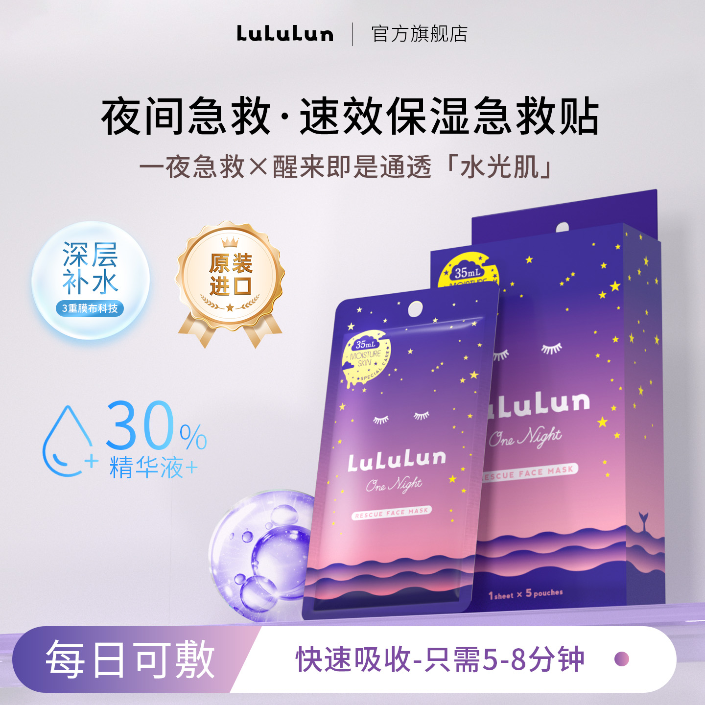 LuLuLun原装正品夜间急救补水深层清透保湿滋润日本面膜5片/盒