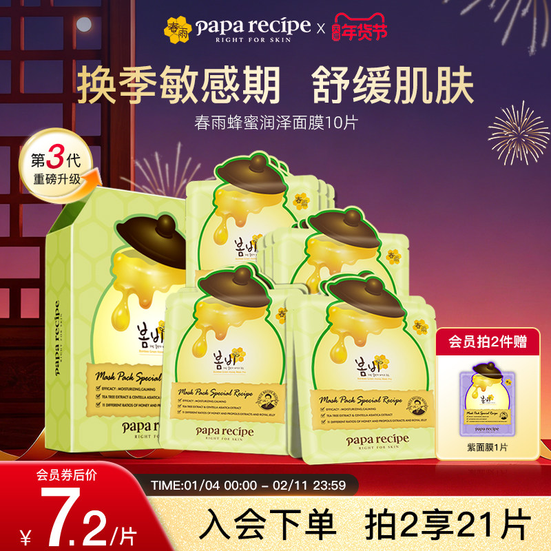 韩国paparecipe绿春雨蜂蜜面膜积雪草茶树鱼腥草补水保湿舒缓10片