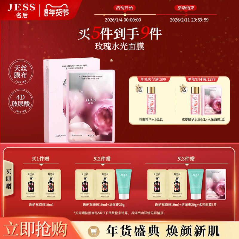JESS名后玫瑰水光补水面膜玻尿酸保湿滋润肌肤天丝膜布贴片面膜