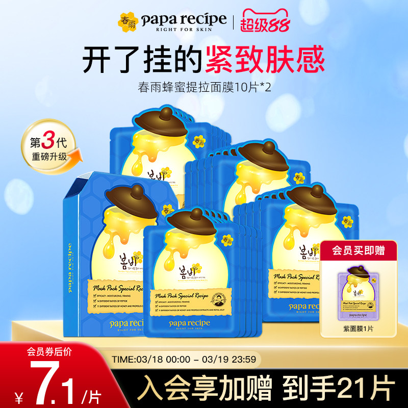 韩国paparecipe蓝春雨蜂蜜蓝铜胜肽胶原蛋白面膜紧致提拉20片正品