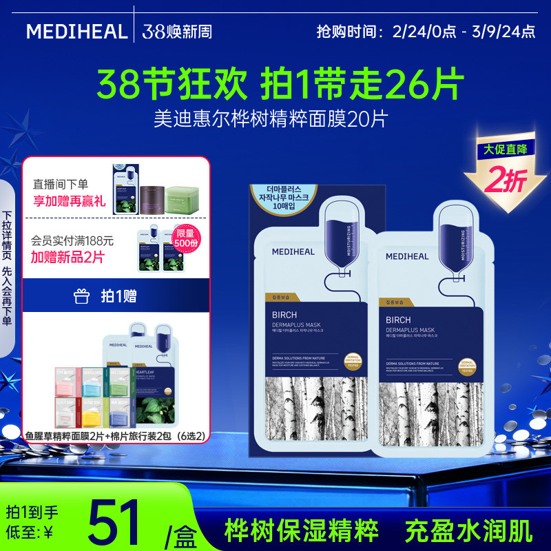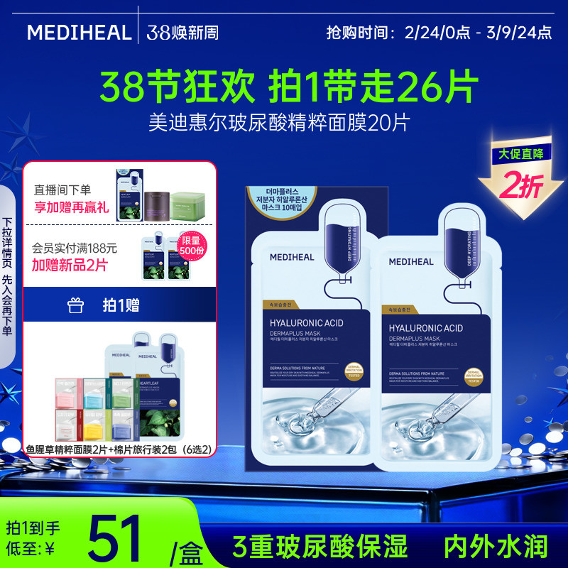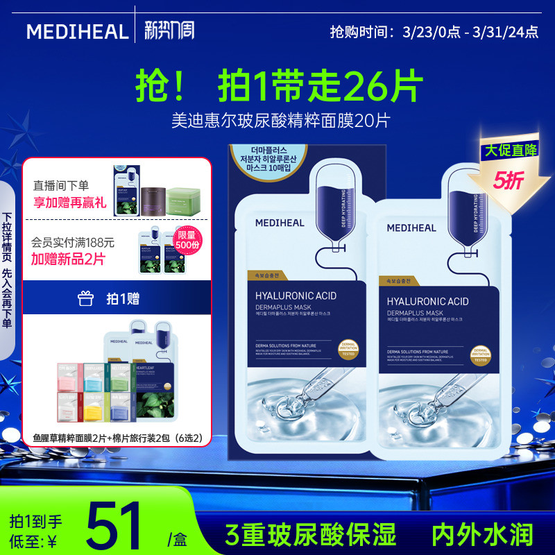 【重磅新品】美迪惠尔官方旗舰店玻尿酸精粹面膜20片补水保湿低敏