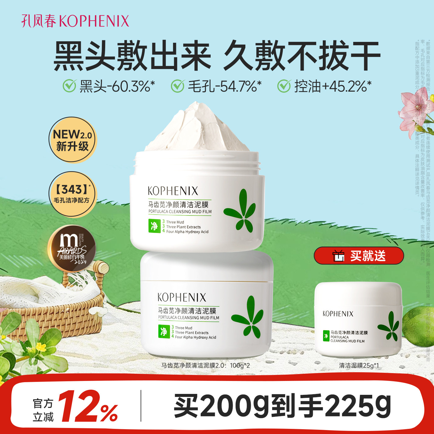 【爆款】孔凤春马齿苋清洁泥膜去黑头收缩毛孔白泥涂抹面膜正品女