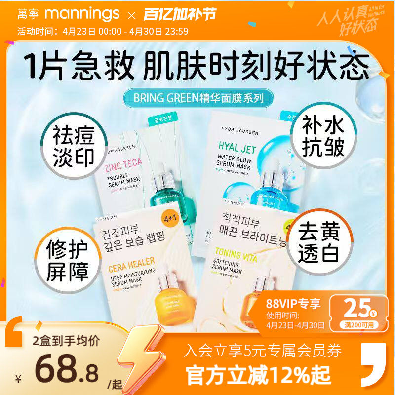 BRINGGREEN芭兰歌林安瓶精华面膜韩国祛痘提亮积雪草oliveyoung