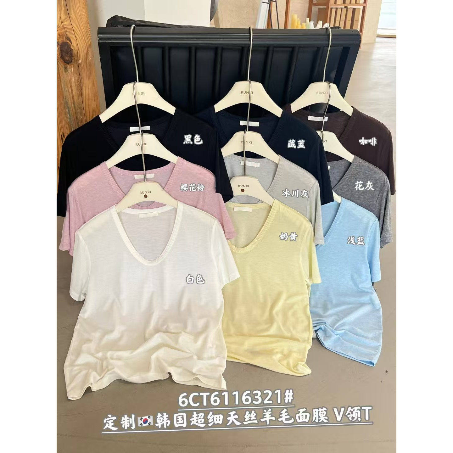 runxi闰熙6321-6韩国定制天丝羊毛面膜V领短袖T恤上衣女宽松百搭t