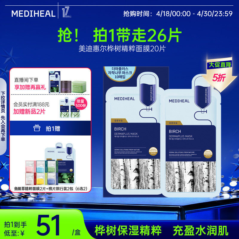 【爆款精粹】美迪惠尔官方旗舰桦树精粹面膜20片嫩滑润泽补水保湿