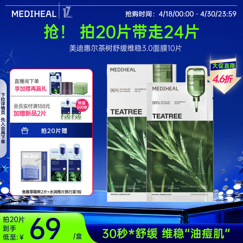 美迪惠尔茶树舒缓维稳3.0面膜10片维稳痘肌控油抗皱