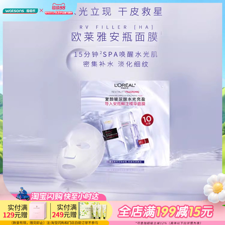 屈臣氏欧莱雅复颜玻尿酸水光导入安瓶精华青春密码面膜套装10片