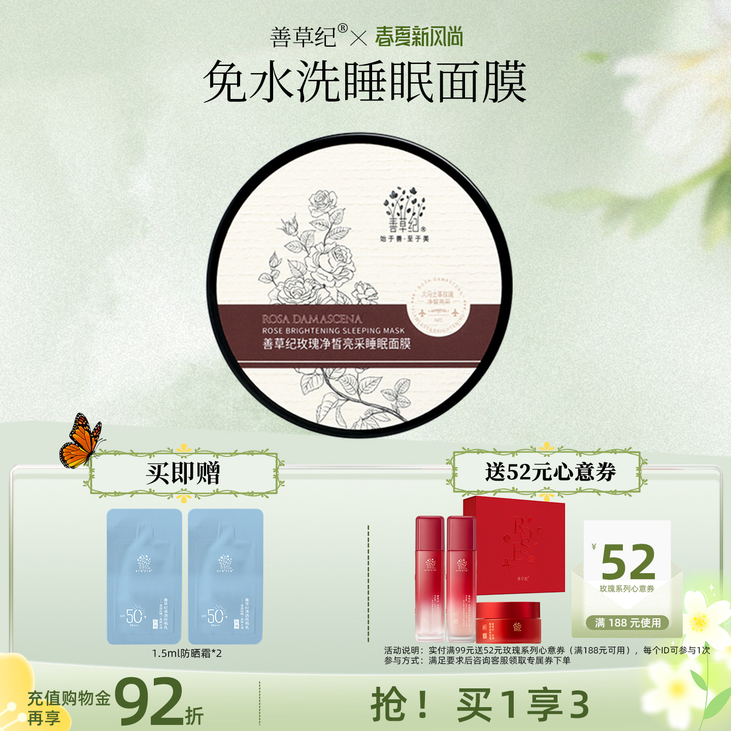 【29.9元秒杀】善草纪玫瑰睡眠面膜补水保湿滋润提亮暗沉肌面膜