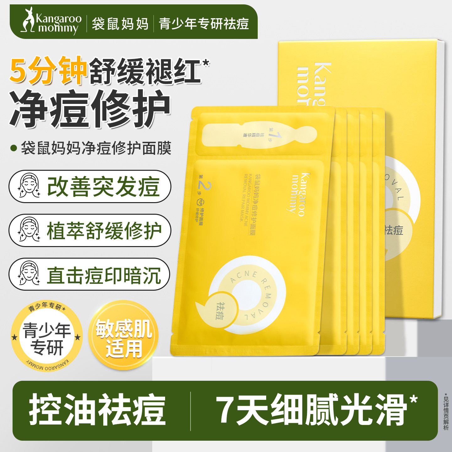 袋鼠妈妈祛痘面膜青少年中学生净痘改善痘肌出油贴片面膜男女通用