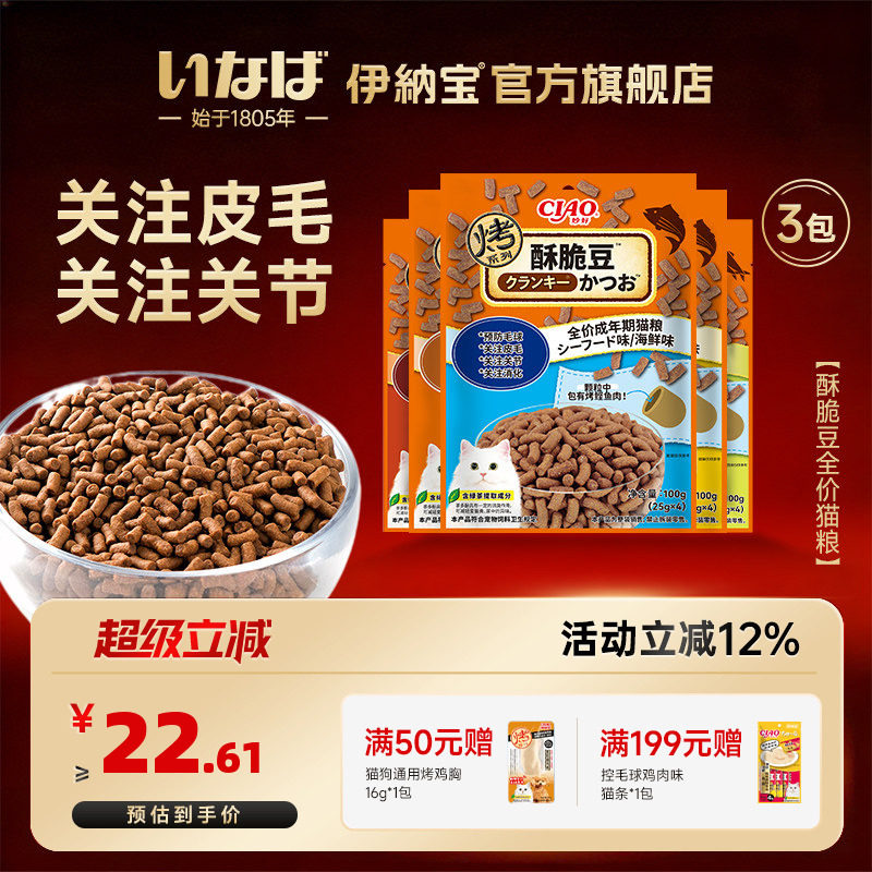 伊纳宝猫零食鲣鱼肉猫咪专用鸡肉鱼肉猫粮酥脆豆ciao全价成猫粮