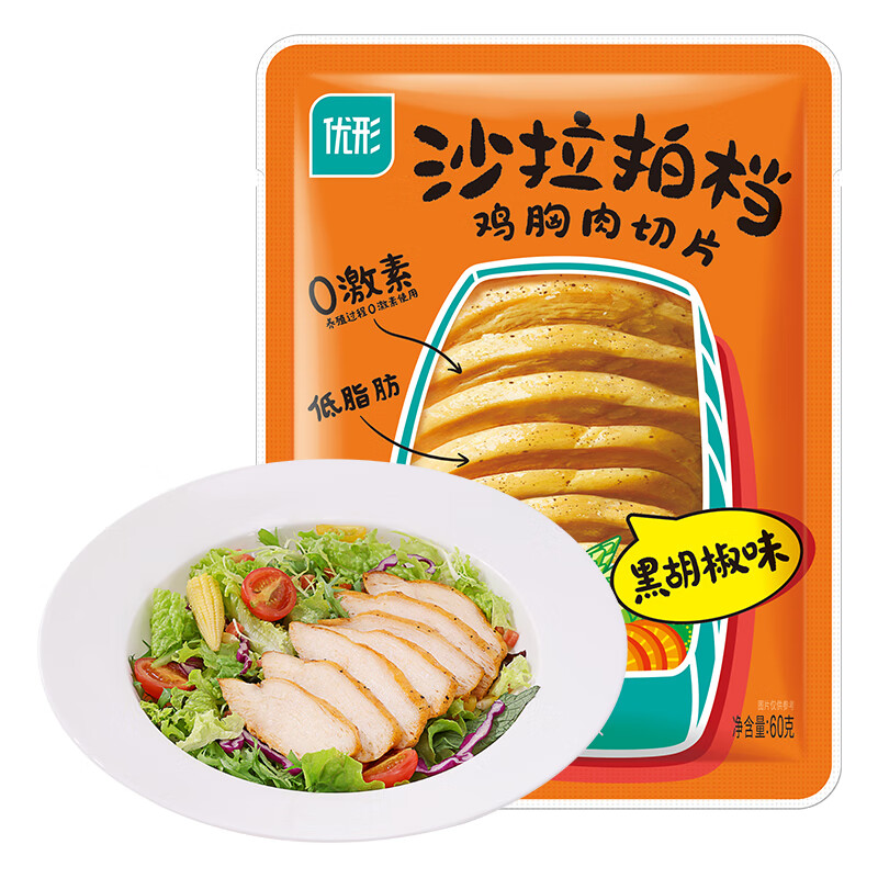 优形(ishape)【京东速发】沙拉鸡胸肉切片沙拉拍档低脂肪高蛋白健身代餐即零食 【尝鲜装300g】黑胡椒味60g*5袋