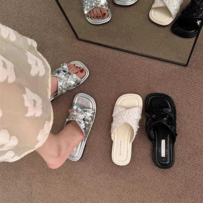 大码女鞋41一43韩版亮片法式凉拖鞋女外穿2024年新款平底交叉拖鞋