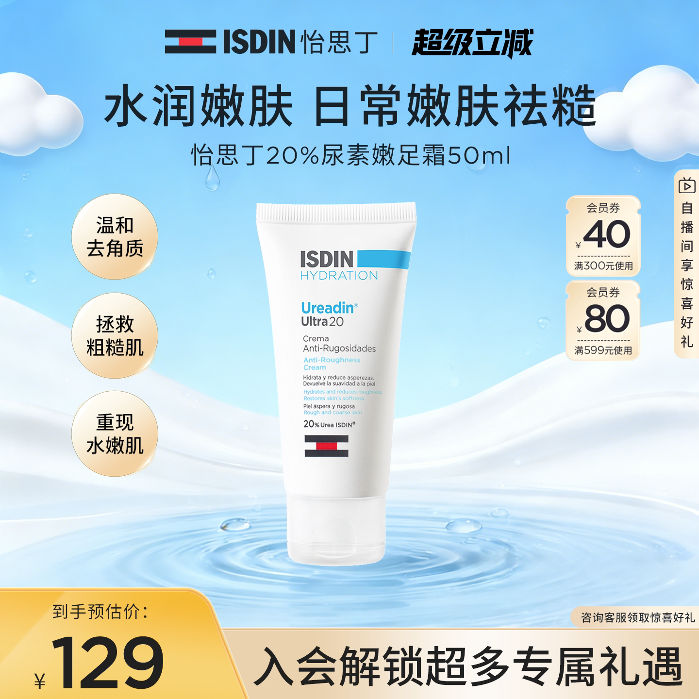 ISDIN怡思丁保湿嫩滑去角质去死皮去老茧粗糙鸡皮尿素嫩皮霜50ml