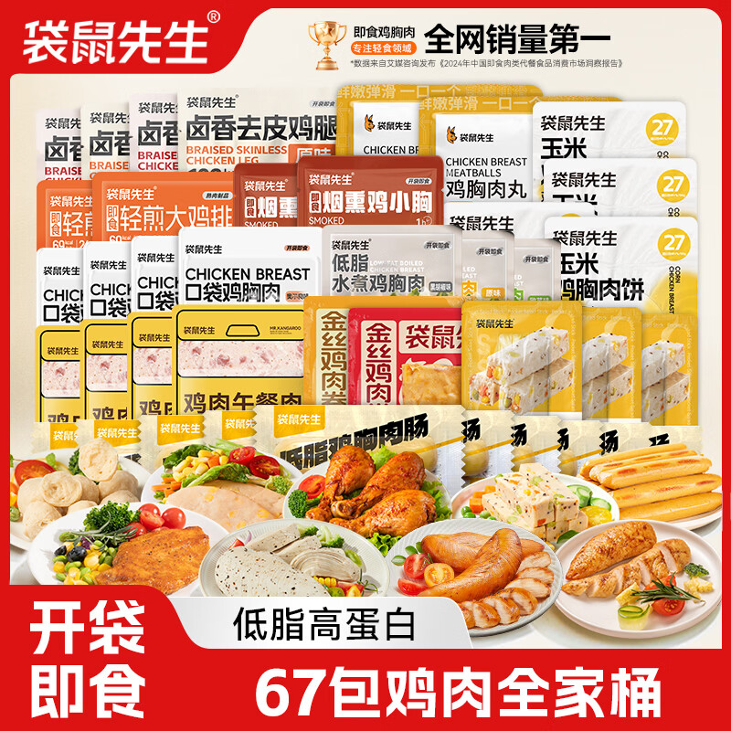袋鼠先生纯鸡胸肉即食低脂卡健身减代餐开袋速食高蛋白鸡胸脯肉休闲零食餐 【新品上新】67包鸡肉全家桶