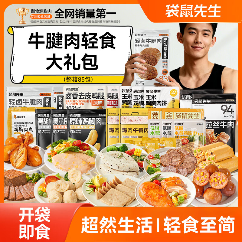 袋鼠先生即食牛肉牛腱肉代餐礼包套餐开袋鸡胸肉高蛋白健身大礼包 85包轻食牛腱肉大礼包3975g*1箱