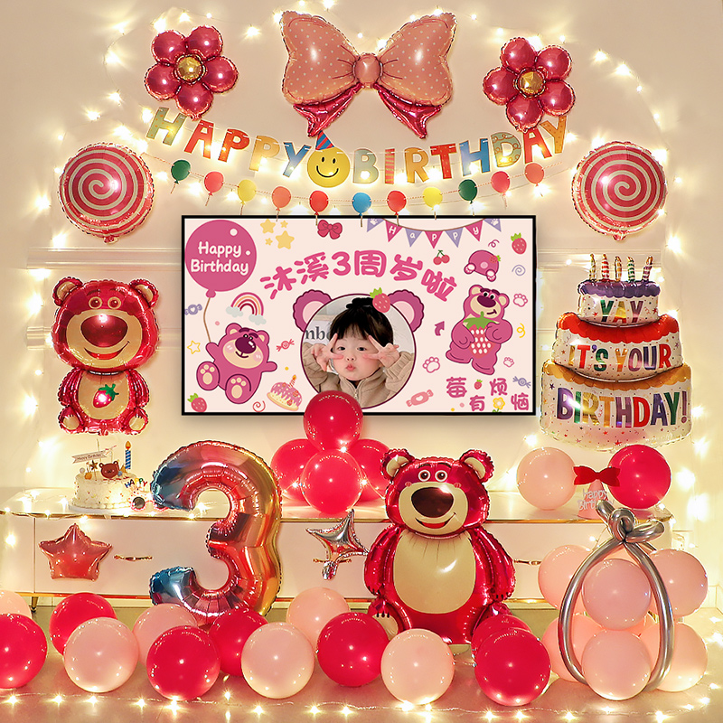 草莓熊生日主题装饰品女孩宝宝周岁背景墙电视投屏场景布置用品