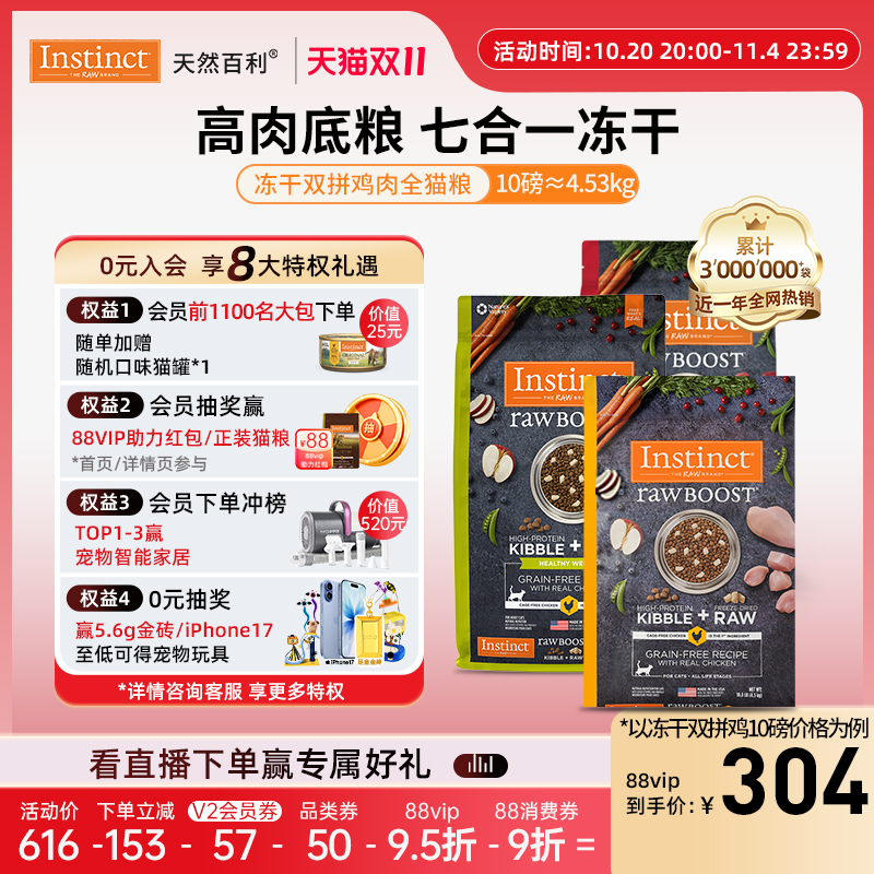 【双11现货】Instinct百利冻干双拼美国进口生鲜鸡健康体态全猫粮