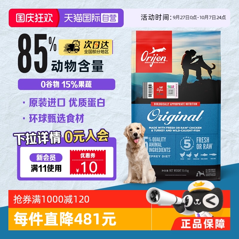 【自营】Orijen渴望无谷鸡肉通用型美国进口全犬原味狗粮11.4kg